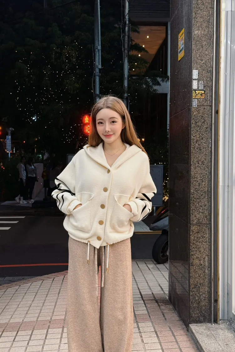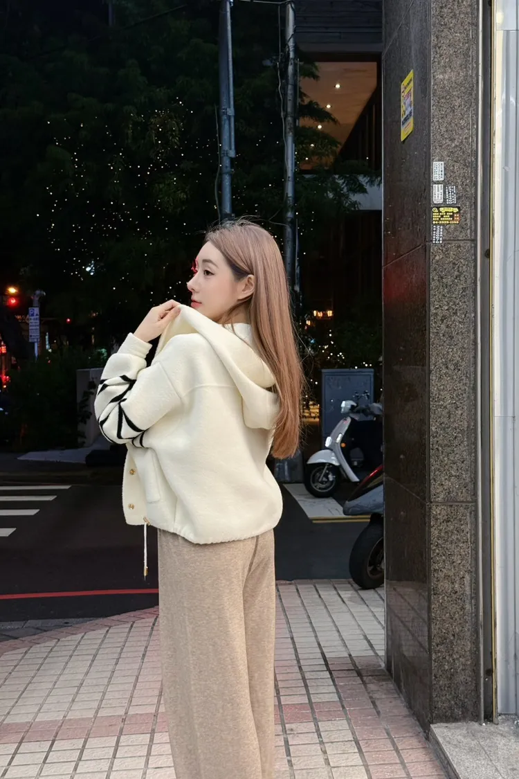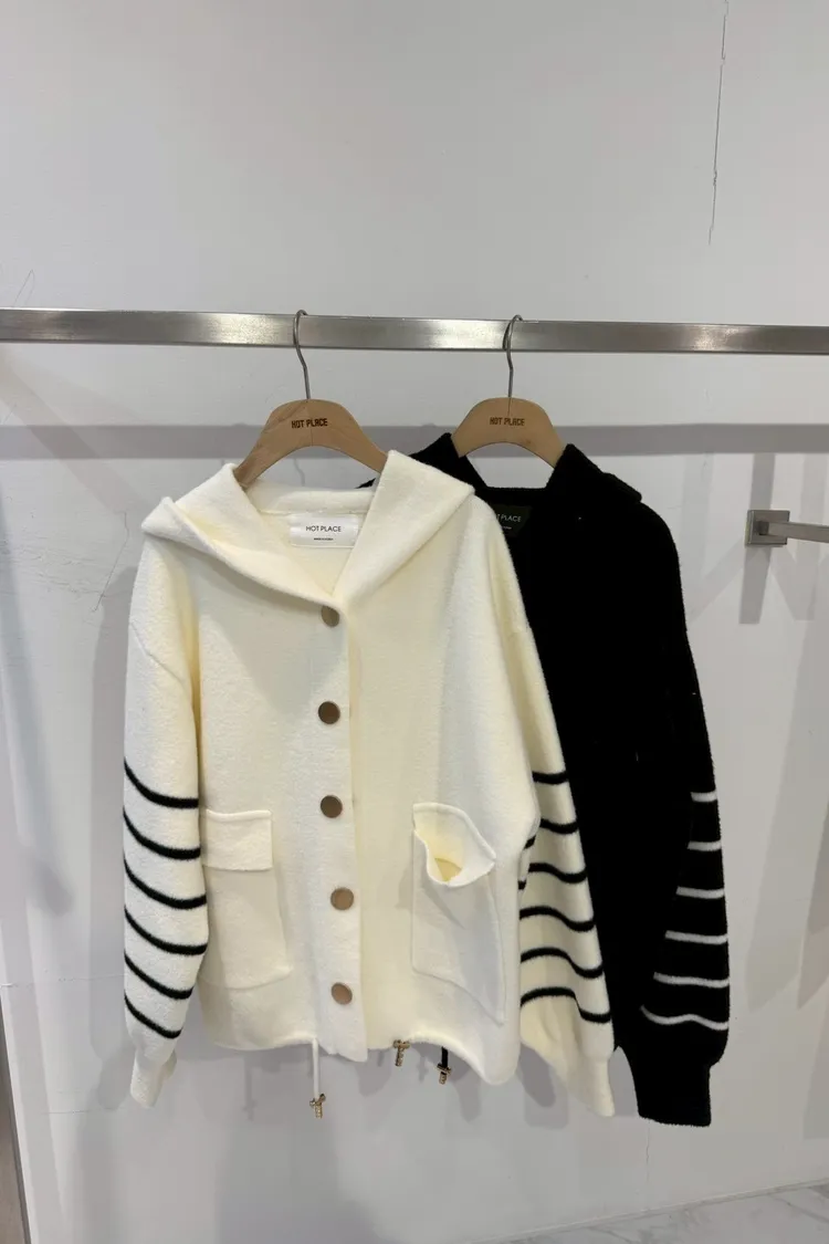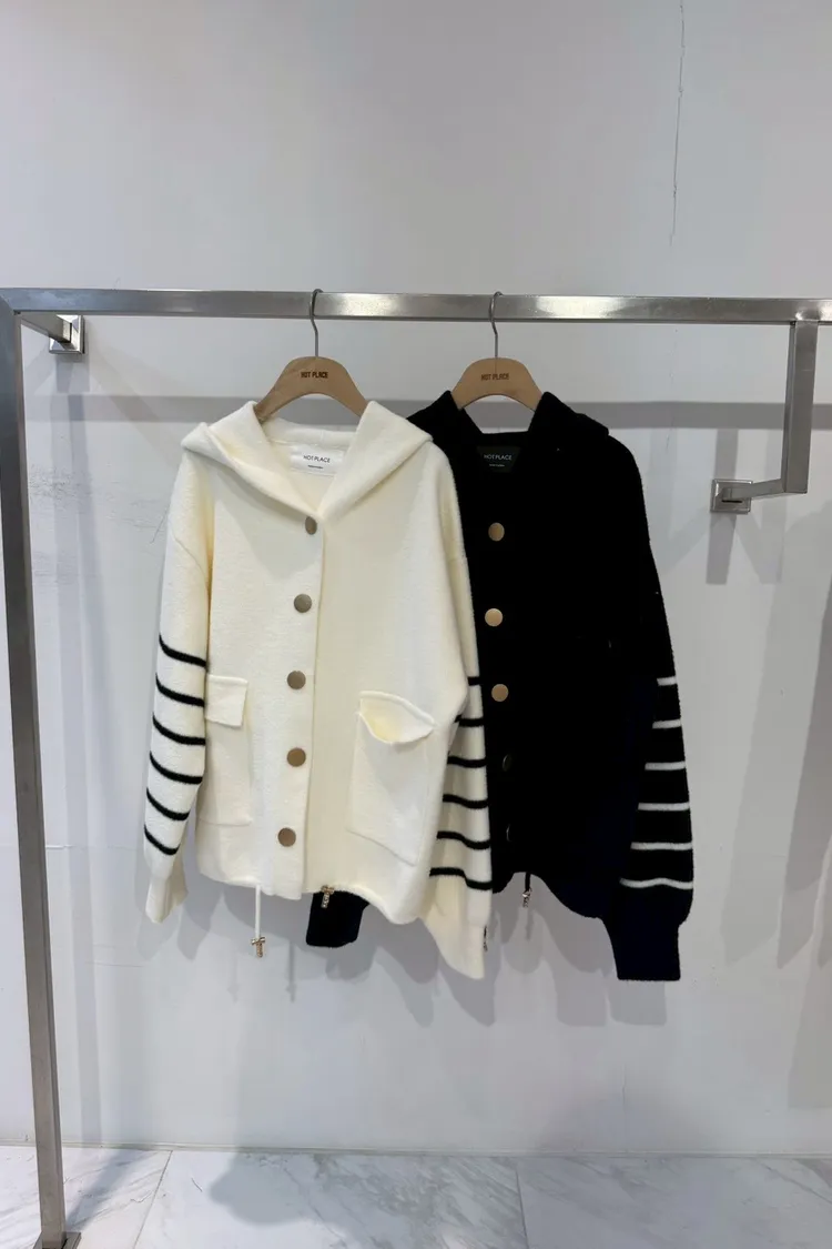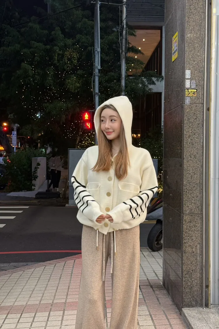 柔霧奶油條紋針織連帽外套